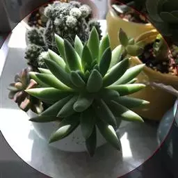大和锦是景天科拟石莲花属的多肉植物。肉质叶排成紧密的莲座状,广卵形至散三角卵形,背面突起呈龙骨状,…