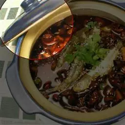 2、 在炒好的茄子里加入清汤煮烂,加酱油、白糖调味。