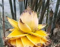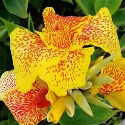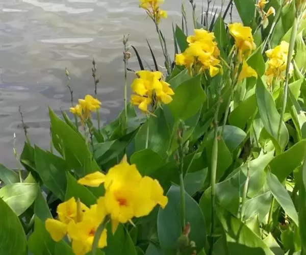 黄花美人蕉(学名:Canna indica L. var. flava Roxb.):多年生草本植物,高可达1.5米,全株绿色无毛,被蜡质白粉。具块状根茎。地上枝丛生。单叶互生;具鞘状的叶柄;叶片卵状长圆形。总状花序,花单生或对生;萼片3,绿白色;花冠、退化雄蕊杏黄色与正种美人蕉不同。唇瓣披针形,弯曲;蒴里,长卵形,绿色,花、果期3-12月。