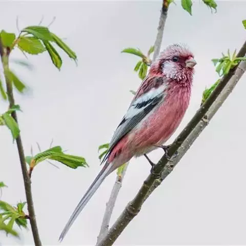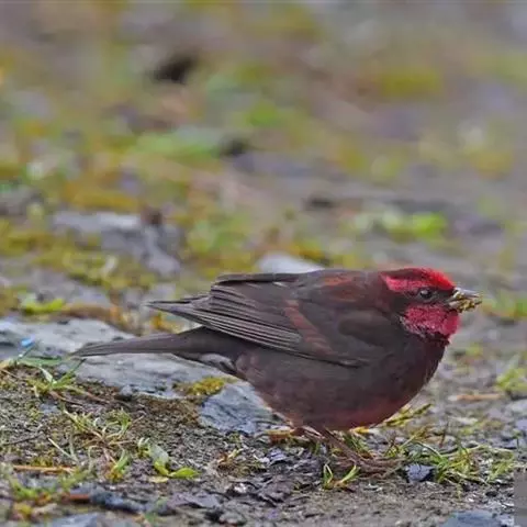 藏朱雀:全长约17-18厘米。雄鸟头部深红色具光辉,喉部暗红色具白色点斑;背部灰白色,各羽具玫瑰红…