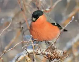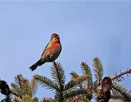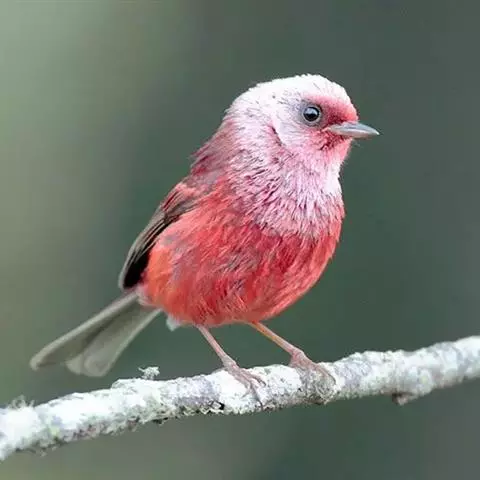 红腰朱雀:体长12-14厘米,小型鸟类。雄鸟前额和眉纹玫瑰粉红色,头顶和一宽的贯眼带深红褐色,背红…
