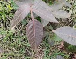 粉背黄栌叶卵圆形,较大,长3.5-10厘米,宽2.5-7.5厘米,无毛,但叶背显著被白粉;叶柄较长,…