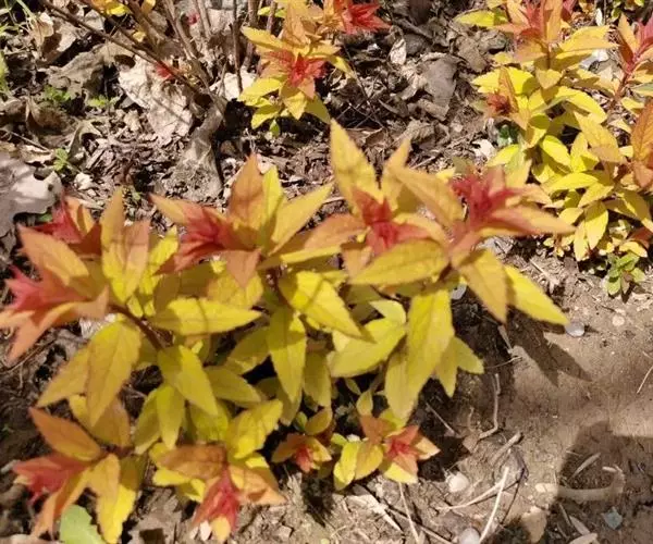金焰绣线菊(Spiraea x bumalda cv.Gold Flame),栽培种,为落叶灌木,芽小,芽鳞2-8。单叶互生,具锯齿、缺刻或分裂,稀全缘,羽状脉,或基部具3-5出脉,叶柄短,无托叶。花两性,稀杂性;花序伞形、伞形总状、伞房状或圆锥状;萼筒钟状,萼片5,花瓣5,常圆形;雄蕊15-60,着生在花盘外缘;心皮5(3-8),离生。瞢荚果5,常沿腹缝开裂。种子数粒、细小;胚乳量或无。其叶色有丰富的季相变化,有较高的观赏价值。