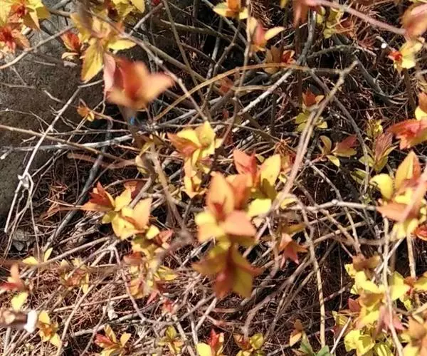 金焰绣线菊为落叶小灌木,株高60~110cm,冠幅90~120cm,老枝黑褐色,新枝黄褐色,枝 金焰绣线菊 条呈折线状,不通直,柔软。冬芽小,有鳞片,单叶互生,边缘具尖锐重锯齿,羽状脉。叶长0.8~3.0cm,宽0.5~1.6cm,叶柄0.2~0.4cm。
