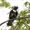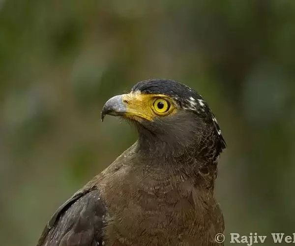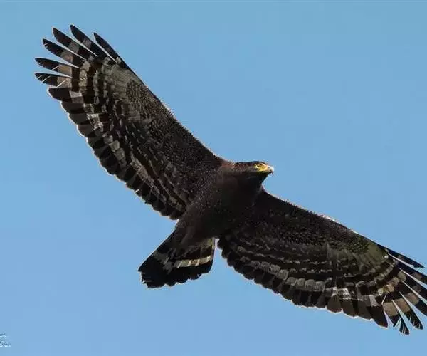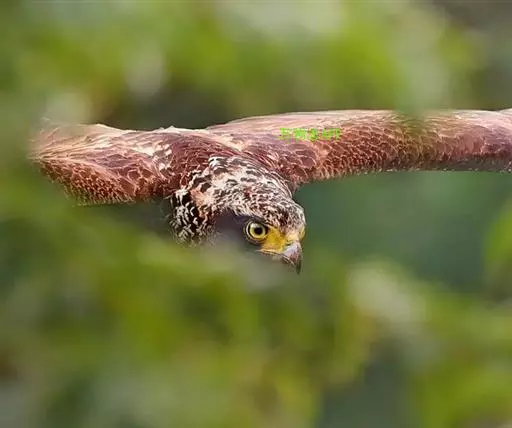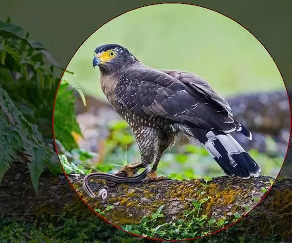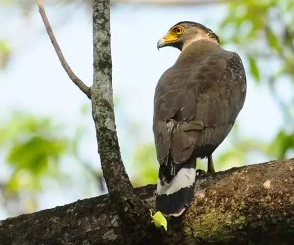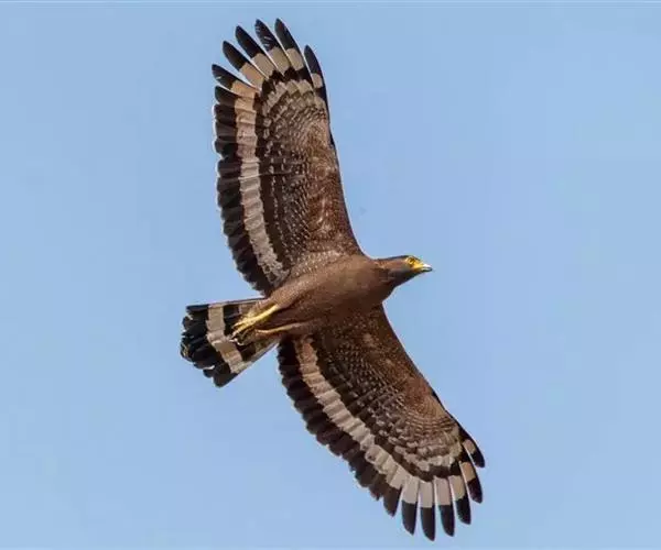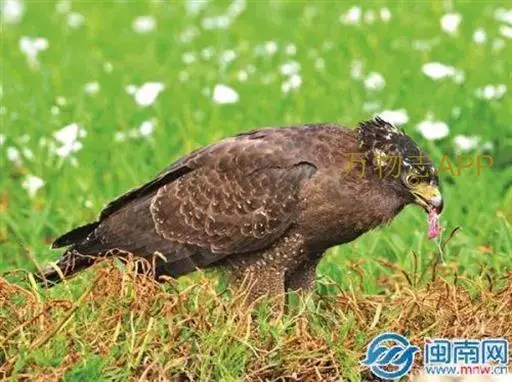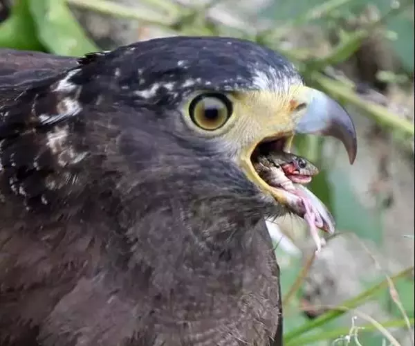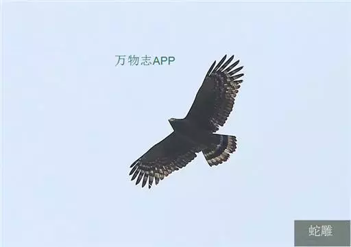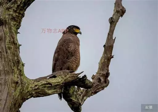 蛇雕(学名:Spilornis cheela):共有21个亚种。全长61-73厘米,大中型鹰类。头顶具黑色杂白的圆形羽冠,覆盖后头。上体暗褐色,下体土黄色,颏、喉具暗褐色细横纹,腹部有黑白两色虫眼斑。飞羽暗褐色,羽端具白色羽缘;尾黑色,中间有一条宽的淡褐色带斑:尾下覆羽白色。喙灰绿色,蜡膜黄色。跗蹠及趾黄色,爪黑色。