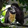 幼鸟头顶和羽冠白色,具黑色尖端,贯眼纹黑色,背暗褐色,杂有白色斑点。下体白色,喉和胸具暗色羽轴纹,覆腿羽具横斑,尾灰色,具两道宽阔的黑色横斑和黑色端斑。