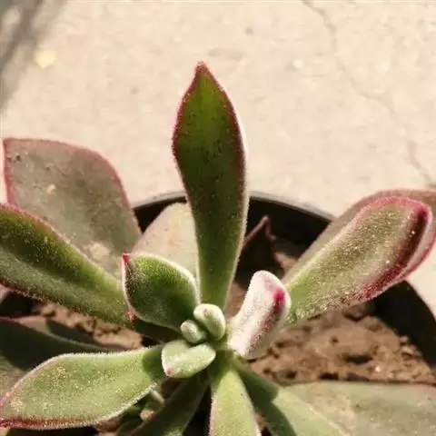 叶片呈莲座状排列,叶色为红绿色,叶片边缘和背面都为红色,叶尖有小尖尖。