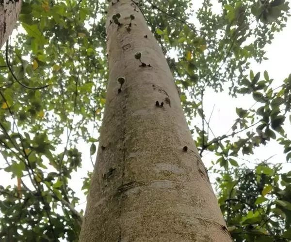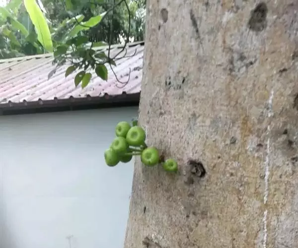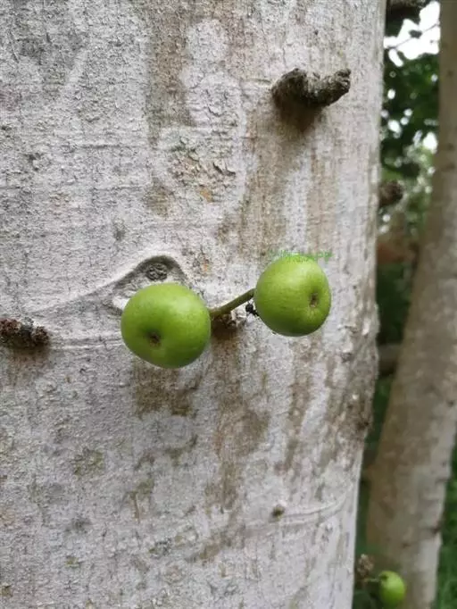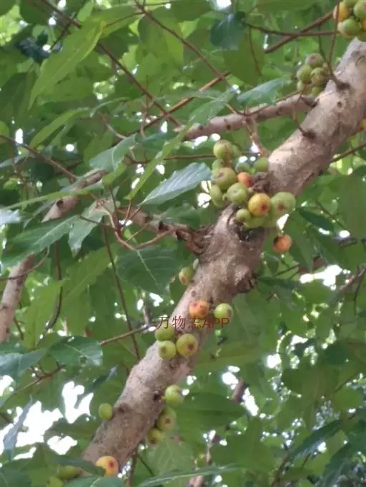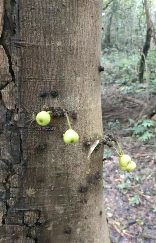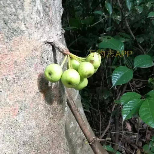 乔木,高7-10米,树皮灰褐色,平滑,胸径10-15(-17)厘米,幼枝绿色,微 被柔毛。叶互生,厚纸质,广卵形至卵状椭圆形,长10-17厘米,顶端渐尖或钝,基部 圆形至浅心形,边缘波状或具浅疏锯齿;幼叶背面被柔毛,基生叶脉5条,近基部的2条 细小,侧脉4-6对;叶柄长2.5-6厘米,托叶卵状披针形,无毛,长1-1.5厘米。榕 果簇生于老茎发出的瘤状短枝上,球形,直径2.5-3厘米,顶部微压扁,顶生苞片卵圆 形,脐状微凸起,基生苞片3,早落,残存环状疤痕,成熟榕果红色,有绿色条纹和斑点; 总梗长2-4厘米;雄花生榕果内壁口部,花被片3-4,宽卵形,雄蕊2,花丝基部合生 成一柄;瘿花生内壁近口部,花被合生,管状,顶端4-5齿裂,包围子房,花柱侧生, 短,柱头漏斗形;雌花生于雌植株榕果内壁,花被片3-4,条状披针形,薄膜质,基部 合生。瘦果倒卵形,薄被瘤体,花柱与瘦果等长,柱头棒状,无毛。花期冬季。