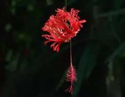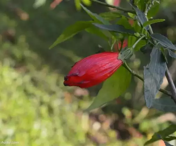 常绿灌木,外型略似朱槿,但叶片较为狭昌浓绿;花朵不若其他朱槿类会完全展开,鲜红的花瓣螺旋卷屈,呈吊钟状,雌雄蕊细长突出瓣外苞,花瓣略左旋,不开含苞状,鱼红色,叶阔心形,浅二裂或角状。