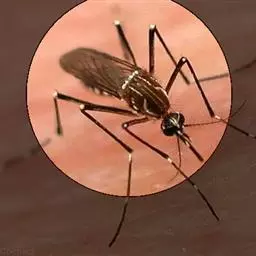 雄虫:体长10毫米左右。复眼鲜红,两眼前缘合生,额狭似线,复眼上部2/3的小眼面很大,下部1/3的小眼面很小,二者界限显明,在整个长度内约有小眼面25排。触角桔黄,第三节长超过第二节长的3倍以上,芒毛黑,长羽状毛达于末端;胸部呈金属绿色有铜色反光及蓝色光泽,前盾片覆有薄而明显的灰白色粉被;各侧片毛绝大多数呈黑色,腹侧片呈暗棕色。翅透明,翅脉棕色,翅肩鳞及前缘基鳞黑,腋瓣带棕色,具暗棕以至棕黑色缘。缘缨除上、下腋瓣交接处呈白色外,大部呈灰色至黑色,平衡棒暗棕或棕色。足棕或棕黑色。腹部绿蓝色,铜色光泽明显。肛尾叶及侧尾叶均宽短,阳体细长,下阳体呈半球形。