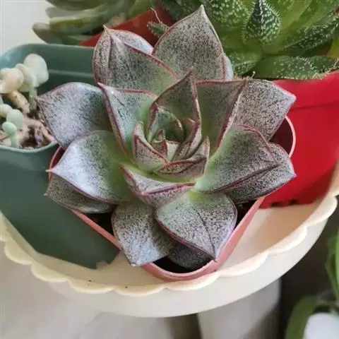 大和锦是景天科拟石莲花属的多肉植物。肉质叶排成紧密的莲座状,广卵形至散三角卵形,背面突起呈龙骨状,…