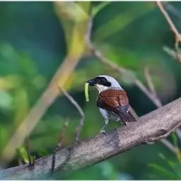 虎纹伯劳:全长165毫米左右。雄性成鸟:额基、眼先和宽阔的贯眼纹黑色;前额、头顶至后颈蓝灰色;上体余部包括肩羽及翅上覆羽栗红褐色,杂以黑色波状横斑;飞羽暗褐色,外翻具棕褐色羽缘;尾羽棕褐色,具不明显的褐色横斑,外侧尾羽端缘棕白色;下体纯白色,两胁略沾蓝灰色;覆腿羽白杂以黑斑。雌性成鸟羽色与雄鸟相似,但前额基部黑色较小,眼先及过眼黑纹沾褐,头顶灰色及背羽的栗褐色均不如雄鸟鲜艳;胁部缀以黑褐色鳞状横斑。一般栖息于树林、分布自平原至丘陵、山地,喜栖于疏林边缘以及巢址选在带荆棘的灌木及洋槐等阔叶树。性格凶猛,常停栖在固定场所,寻觅和抓捕猎物。主要食物是昆虫,特别是蝗虫、蟋蟀、甲虫、臭虫、蝴蝶和飞蛾,也吃小鸟和蜥蜴。分布于亚洲多国,该物种的模式产地在印度尼西亚爪哇。