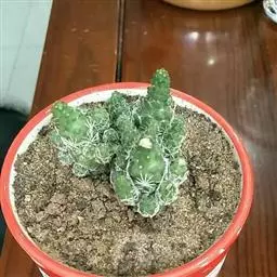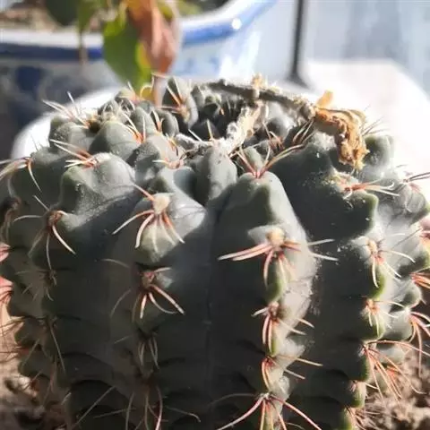 茎球形至短圆筒形,高15-30厘米,径8-12厘米,浓绿色,顶部凸起,13棱,棱脊高白色带褐晕,刺座排列密,中刺1-3枚,长1.5-2厘米,淡红褐色,边刺6-16枚,向外开展,长约4厘米,外围被白绵毛。