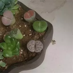 荒玉为番杏科生石花属,原产南非。株体呈白粉色,表面布满凹凸纹路,凹陷处为红褐色,每年秋季开黄花。