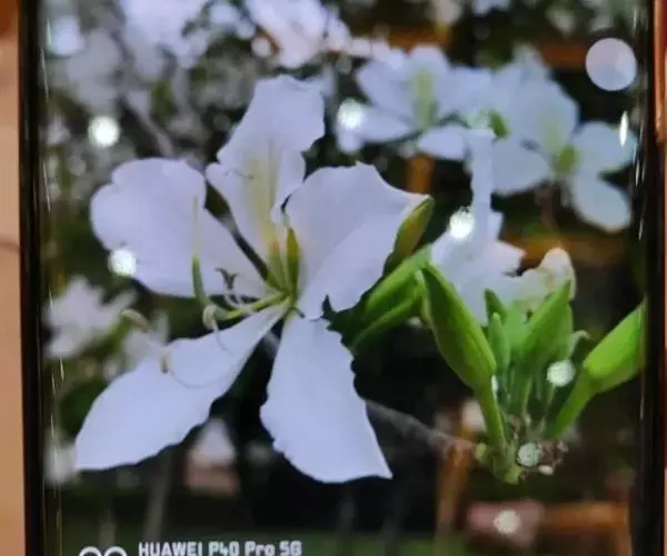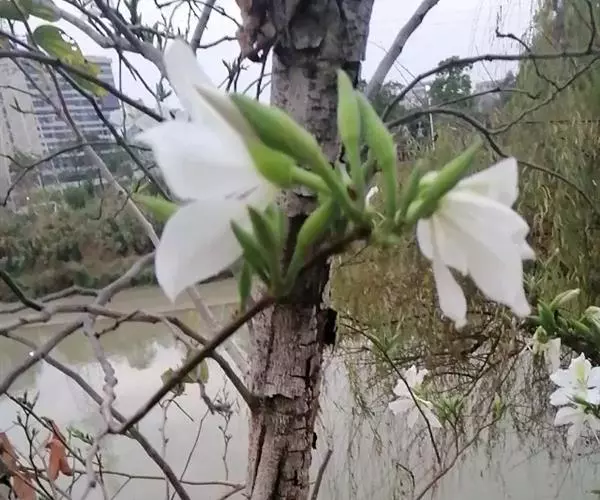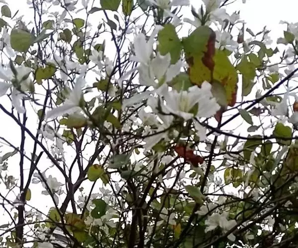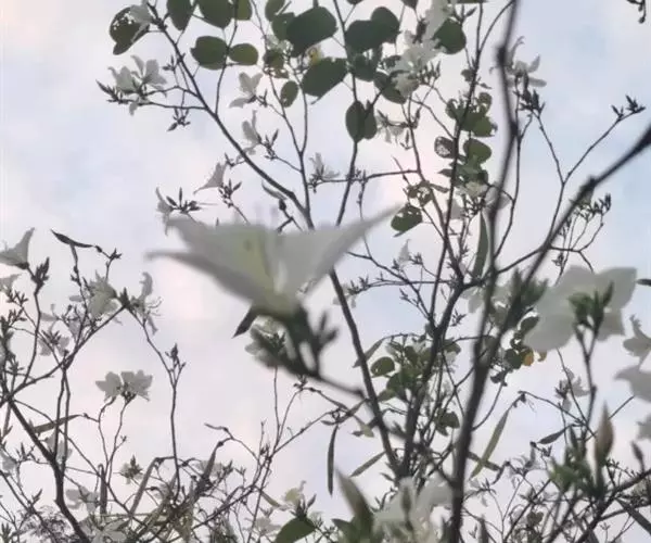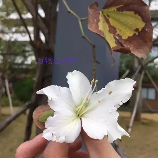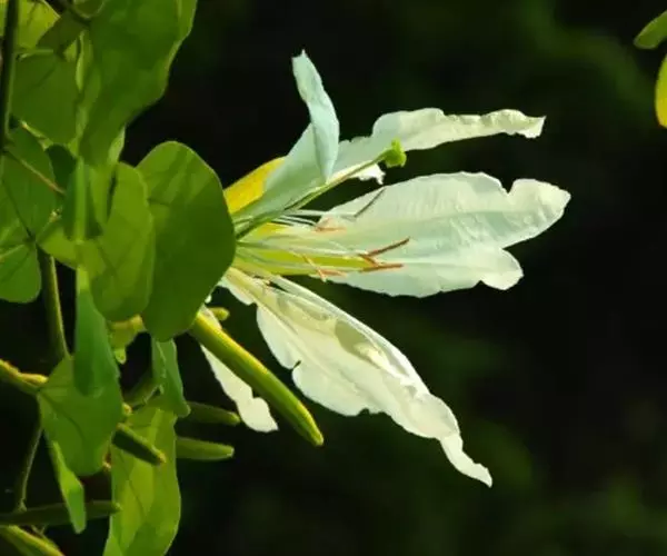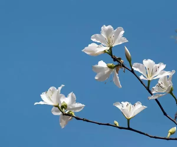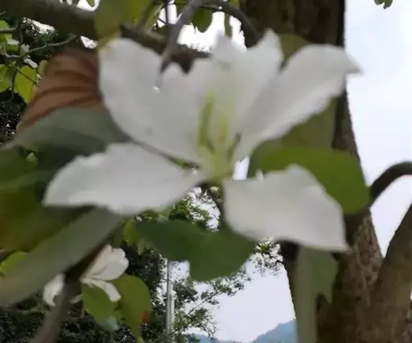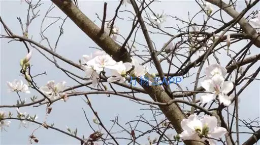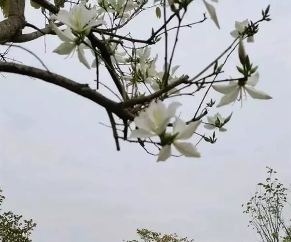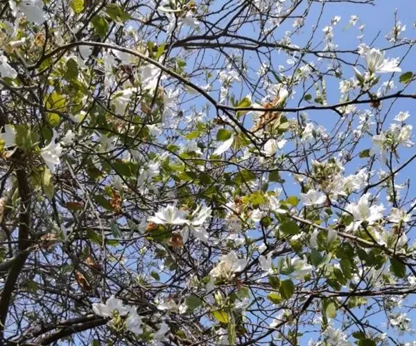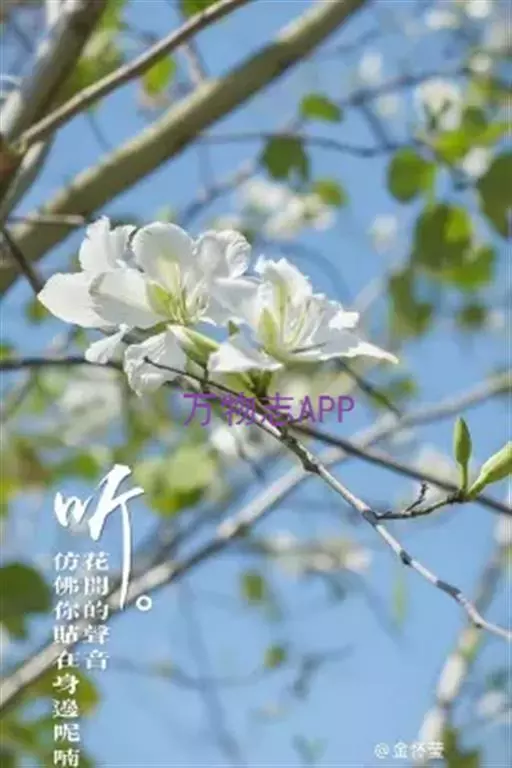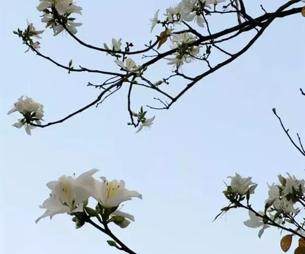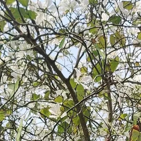 白花羊蹄甲的花数朵聚生,芳香,五杖分离花瓣,观赏花,白色。花期:春天,春天开花,先开花后才出叶,树上一片白色,相当容易辨认。