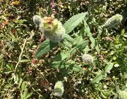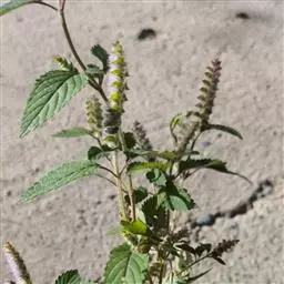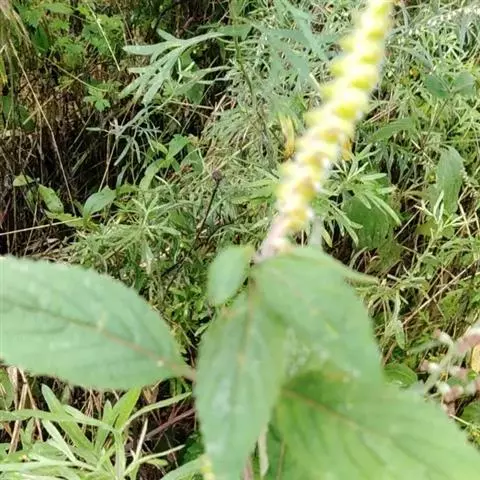 草本至半灌木。茎高0.3-1.5米,多分枝,枝钝四稜形,密被白色微柔毛。叶卵形,椭圆形至近菱状卵形,长2-7.5厘米,宽1-3.5厘米,先端急尖或微钝,基部圆形至阔楔形,边缘具钝锯齿,近基部全缘,坚纸质,上面榄绿色,被粗硬毛,微皱,下面灰白色,密被灰白色绒毛,侧脉4-6对,与中脉在上面凹陷,下面明显隆起,细脉在下面清晰可见;叶柄纤细,长0.5-2.5厘米,腹凹背凸,密被白色微柔毛。穗状花序着生于主茎及侧枝的顶部,长3-12厘米或以上,具长1.2-2.5厘米的总梗,由具梗的轮伞花序所组成,位于穗状花序下部的轮伞花序疏散;下部1-2对苞叶叶状,但变小,上部呈苞片状,披针形或钻形,长1-3毫米,全缘,被灰白绒毛;花梗长不及1毫米,与序轴密被灰白绒毛。花萼钟形,长约1.5毫米,直径约1毫米,外面被白色粗硬毛,萼齿5,相等或后2齿稍长,长约0.7毫米。花冠白色,有时为紫或淡黄色,长约4毫米,外面被柔毛,内面近喉部具斜向毛环,冠筒长约3毫米,基部宽1毫米,至喉部宽达1.5毫米,冠檐二唇形,上唇直立,长不及1毫米,先端微缺,下唇开展,3裂,中裂片圆形,边缘啮蚀状,长宽约1毫米,侧裂片短,半圆形。雄蕊4,前对较长,伸出,花丝略被毛,花药球形,2室。花柱超出雄蕊,先端2裂。小坚果长圆形,稍压扁,长约1毫米,淡黄色,光滑无毛。花、果期10-12月。