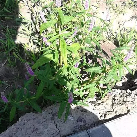 茎呈方柱形,长30-150cm,表面灰褐色或黄褐色,有不规则裂纹和白色短柔毛。叶对生,皱缩或脱落,展平后呈椭圆形或菱状椭圆形,长1-3cm,宽0.5-2cm,表面暗绿色,有皱纹及粗毛茸,背面灰绿色,密生灰白色短柔毛;叶柄长0.5-2.5cm。在顶端或叶腋可见假穗状花序,花黄白色。气香,味辛、凉。