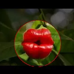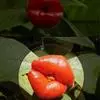这种奇异植物的花朵一般会盛开长在两片红艳的“嘴唇”之间。一场丛林疾雨过后,鲜润的“嘴唇”中间含着一朵小巧的花朵,一般为黄色,使它更显妖娆。