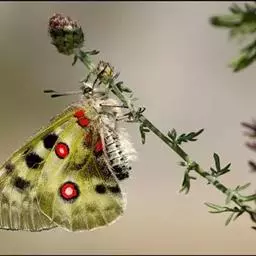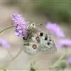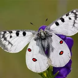 阿波罗绢蝶:翅展约7-8.4厘米。前翅较圆,白垩色,翅表有许多黑点、灰白斑及无鳞透明区,…