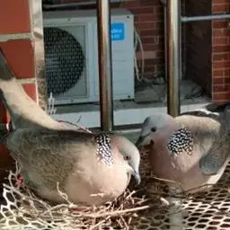 该物种的繁殖季节因地区而异。通常在4-10月。或许1年繁殖2-3窝。通常成对或成小群在一起营巢繁殖,多营巢于村前屋后树上或公园和果园中的树上,高于地面15米左右。也在竹林、灌从和建筑物上以及废弃的房屋中营巢,亦经常营巢于房屋的阳台、排水管、墙壁上或房檐下。有时直接营巢于裸露的地上。巢呈浅盘状,甚为简陋,主要由枯枝堆集而成,结构甚为松散粗糙。每窝产卵2枚,卵白色,呈卵圆形,大小为23-29毫米×18-21毫米。
