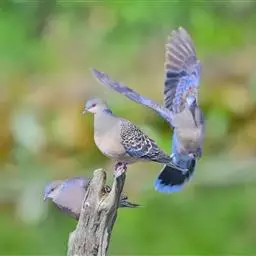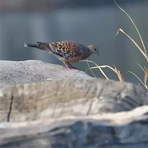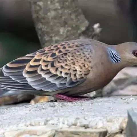 山斑鸠,是鸽形目鸽鸠科斑鸠属鸟类,又名金背斑鸠、棕背斑鸠、山鸠、金背鸠、麒麟斑、麒麟鸠、东方斑鸠、绿斑鸠、山鸽子。山斑鸠颈侧具明显黑白色条纹的块状斑,上体深褐色、具扇贝状斑纹,羽缘棕色,尾羽近黑色,下体多偏粉色。虹膜黄色,喙灰色,脚粉色。山斑鸠是留鸟,在中国常见且分布广泛。此外,还分布于不丹、尼泊尔、巴基斯坦、印度、日本等国。栖息于针阔混交林、季风常绿阔叶林、果园及农耕区,多成对活动于开阔农耕区、村舍、寺院周围及防火林带。取食于地面,主要觅食植物种子、果实、嫩芽等,也吃昆虫。山斑鸠飞翔时鼓翼快速,叫声为反复而低沉的“咕咕咕”声。繁殖期在4-7月,营巢于林中树上,通常一年繁殖2窝,窝卵数2枚,由雌雄亲鸟轮流孵卵,孵化期18~19天。山斑鸠的肉、卵可食,肉入药可益气明目、强筋壮骨,治久病气虚、衰弱无力、两目昏暗等病症。山斑鸠啄食杂草种子,对农田清除杂草有益;但有时也刨食农作物及树的种子。山斑鸠