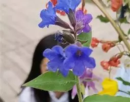 镰状聚伞花序生茎上部叶腋,长2~6厘米,最初有时密集成头状,含多数花;苞片披针形;花萼裂片线形,长1.2~1.6厘米,果期可达3厘米,先端微尖,两面均密生淡黄色硬毛;花冠筒状钟形,深紫色,有时淡黄色带紫红色,外面无毛或稍有短毛,筒部直,长1~1.4厘米,檐部直径6-10毫米,裂片卵形,开展;雄蕊着生于花冠筒中部(长柱花)或喉部(短柱花),花药长约2.5毫米;花柱长达喉部(长柱花)或仅达花筒中部(短柱花),先端浅2裂,柱头2,倒卵形。