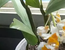 总状花序从具叶或落了叶的老茎上部发出,通常具2-5朵花;花序轴多少回折状弯曲,长3-4厘米;花序柄长5-10毫米,基部被3-4枚短的膜质鞘;花苞片狭披针形,长3-6毫米,先端锐尖;花梗和子房长2-4厘米;花黄绿色,后来转变为乳黄色,开展;中萼片卵状长圆形,长1.5-1.7厘米,宽5-6毫米,先端急尖或稍钝,具5条脉;侧萼片多少斜三角形,与中萼片等长,基部歪斜,宽1-1.3厘米,先端急尖。
