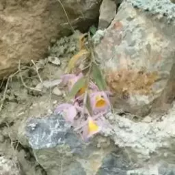 花瓣长圆形,长1.4-1.6厘米,宽4-6毫米,先端锐尖,具5-7条脉;唇瓣椭圆状菱形,不裂,长1.3-1.7厘米,宽8-11毫米,前部外弯,先端锐尖,近基部中央具1个黄色胼胝体;唇盘密布短毛,其前方具1个横向的褐色斑块;蕊柱长约2毫米,前面两侧具紫色斑点;蕊柱足长约1厘米,内面具紫红色斑点;药帽近卵状圆锥形,近光滑。花期4-5月。