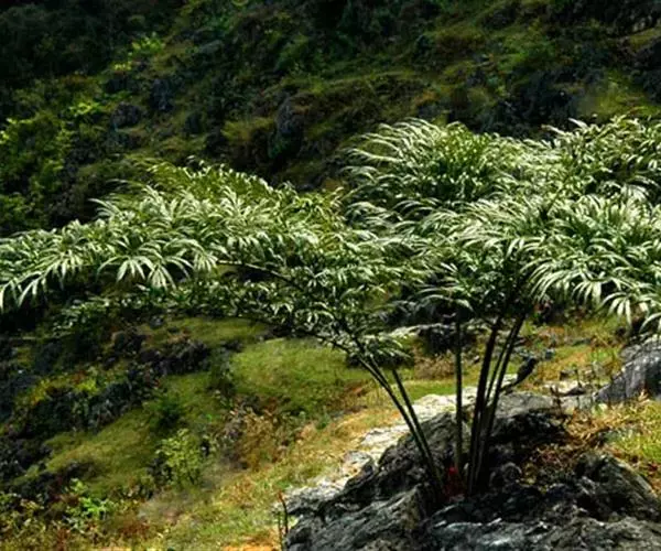 德保苏铁的叶 德保苏铁分布区狭窄,仅产于广西 壮族自治区德保县扶平乡约15.3k㎡的石灰岩山坡;由于人为原因,其数量已从1998年的2000多株锐减到2001年的1085株,尤其是成年植株数量剧减,由此导致年龄结构趋于幼年化,呈现正金字塔的假象;雌雄比从1:10变为1:5,这些现状表明德保苏铁的保护刻不容缓。