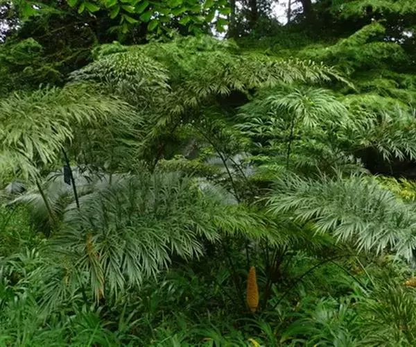 常绿木本植物,树干粗壮,圆柱形, 树干高20-40厘米,直径10-20厘米,褐灰色,叶片只有1片,稀2片,顶生,直立,长达3.5米,宽0.7米。羽片三回羽状,馒形。具12-18枚近对生的一回羽片,以60-90°夹角丛主轴展开,横断面观,以100-130°夹角从主轴上向上张开成龙骨状;一回羽片披针形,中下部一对最长,长35-45厘米,宽12-15厘米,向着两端的逐渐变短,长15-30厘米,宽5-10厘米。具7-11枚互生的二回羽片,横断面观,以95-110°夹角从次级轴上张开成龙骨状。二回羽片扇形或倒三角形,长10-18厘米,宽4-14厘米,(2-)3-5次二歧分枝,在中央,尤在下半部形成合轴,柄长0.5-4厘米。小叶(小羽片)革质,倒卵状条形,长7-12厘米,宽1.0-1.5厘米,先端渐尖,基部渐狭,并下延1.5- 4.0厘米;上面具光泽,深绿色,下面淡绿色,中脉两面稍隆起,下面后变无毛,边缘平或微波状。叶柄近圆柱状,长达2米,粗达2.5厘米;约40对,着生于柄基部至近顶端,圆锥状,微扁,长3-5毫米,刺间距3-5厘米。球花(果)未见。