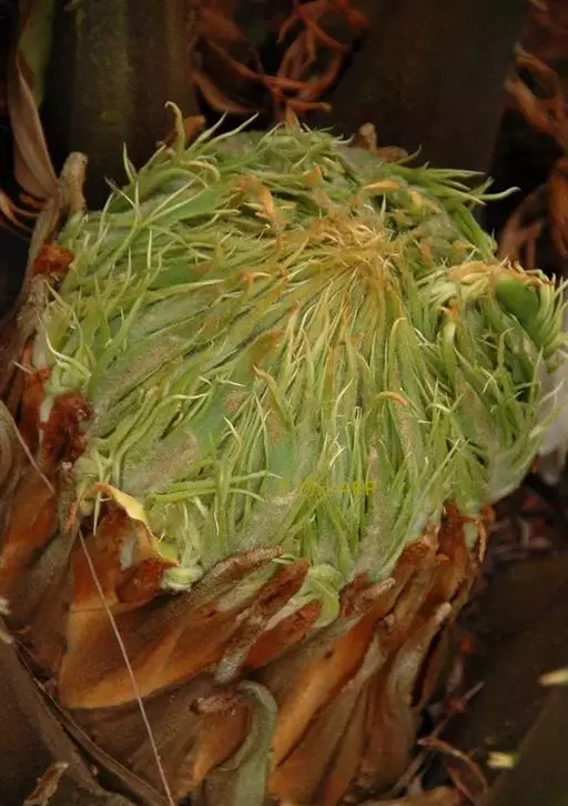 1997年7月的一天,不寻常的事情发生了。广西一位从事植 德保苏铁雌球花 物分类工作的老人在一次很偶然的机会见到了这种植物的标本,居然激动地一夜没有睡好觉,第二天一大早就冒雨出发,赶往石山去寻找。这种植物就是有着极高的科研价值,在世界植物学界引起轰动的德保苏铁。