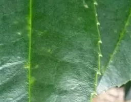 枸骨叶 树皮灰白色,高(0.6~)1~3米;稀有8~10米。幼枝具纵脊及沟,沟内被微柔毛或变无毛,二年枝褐色,三年生枝灰白色,具纵裂缝及隆起的叶痕,无皮孔。