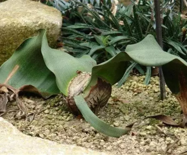 百岁兰主干短而粗,呈倒圆锥状,高很少超过50厘米,直径可达120厘米;主根长达300厘米;叶片带状,具多数平行脉,长达200-350厘米,叶的顶部逐渐枯萎;百岁兰雌雄异株,种子有纸状翼,大多数种子不会发芽。