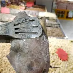 病原待研究。病鱼体色发黑,体表粘液明显减少。病灶位于体表腹部两侧,少数在背部。发病初期皮肤溃烂,充血发炎,肌肉呈椭圆暗红色斑块,如印章,严重者肌肉烂穿。少数并发鲺病及烂鳃病。此病主要危害大口鲇亲鱼及后备亲鱼,无明显流行季节。发病与鱼的营养状况、放养密度、鱼体受伤及水质环境等因素关。 防治方法:(1)青霉素肌肉注射,每千克体重2万国际单位,同时患处用红霉素软膏涂抹。(2)掌握合理放养密度,注意保持水质清新(定期加注新水或适量换水,每隔半月左右用生石灰15~20毫克/升全池泼洒一次),可预防此病发生。