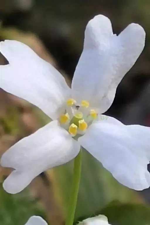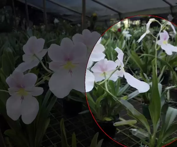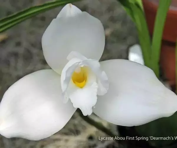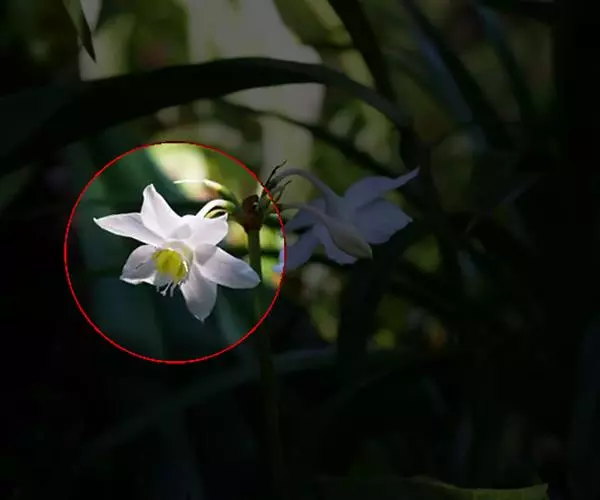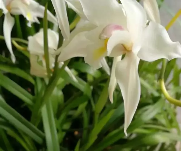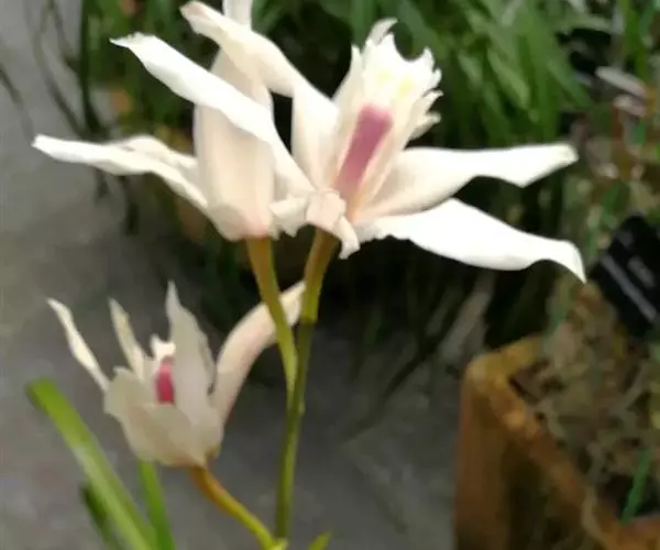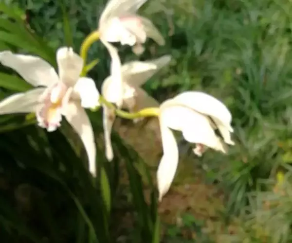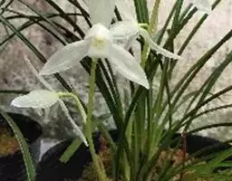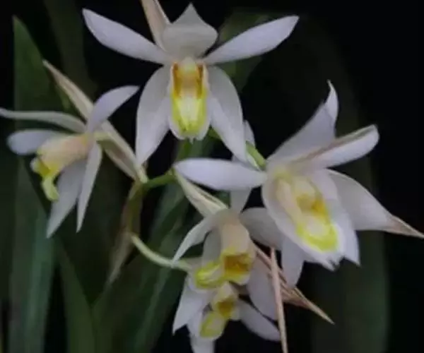 花葶从假鳞茎下部叶腋发出,直立或近直立,长25-40厘米;总状花序具1-2(-3)朵花;花苞片卵状三角形,长6-7毫米;花梗和子房长2.5-3.5厘米;花较大,不完全开放,稍有香气;萼片与花瓣白色,有时略有粉红色晕,唇瓣亦白色,中裂片中央至基部有一黄色斑块,连接于黄色褶片末端,偶见紫粉红色斑点,蕊柱白色或稍带淡粉红色,有时基部有黄色斑块;萼片狭长圆状倒卵形,长5.5-7厘米,宽1.5-2厘米,先端常略钝。