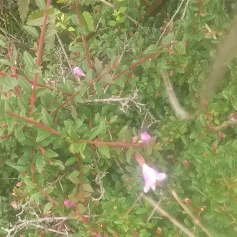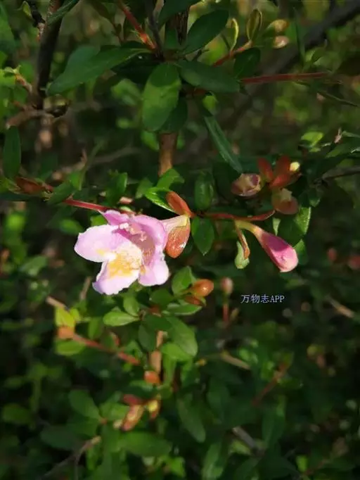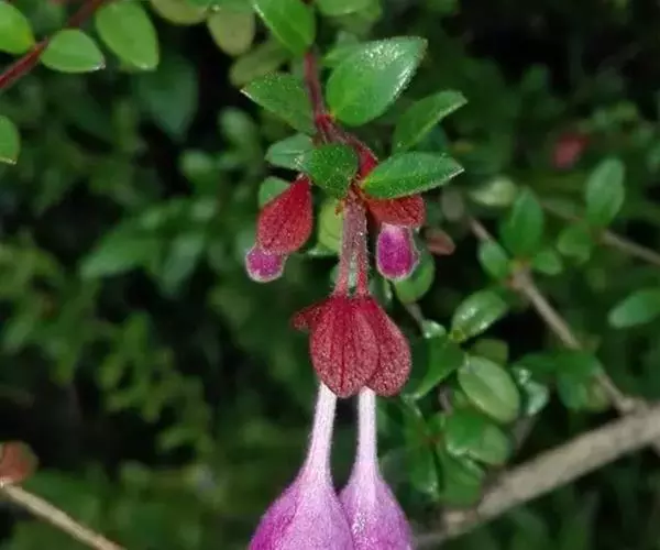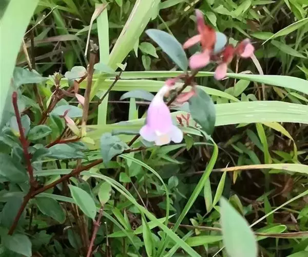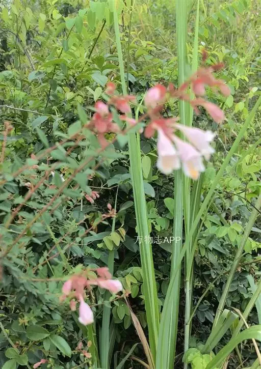 花生于侧生短枝顶端叶腋,由未伸长的带叶花枝构成聚伞花序状;萼筒细长,萼檐2裂,裂片椭圆形,长约1厘米,与萼筒等长;花冠红色,狭钟形,5裂,稍呈二唇形,上唇3裂,下唇2裂,筒基部两侧不等,具浅囊;雄蕊4枚,着生于花冠筒中部,花药长柱形,花丝白色;花柱与雄蕊等长,柱头头状,稍伸出花冠喉部。