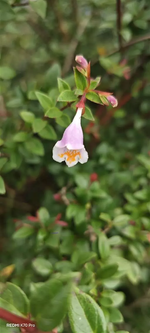 蓪梗花(学名:Abelia engleriana (Graebn.) Rehd. )是忍冬科,六道木属落叶灌木,高可达2米;幼枝红褐色,老枝树皮条裂脱落。叶片圆卵形、狭卵圆形、菱形、狭矩圆形至披针形,花生于侧生短枝顶端叶腋,萼筒细长,裂片椭圆形,花冠红色,狭钟形,花药长柱形,花丝白色;柱头头状,果实长圆柱形,5-6月开花,8-9月结果。
