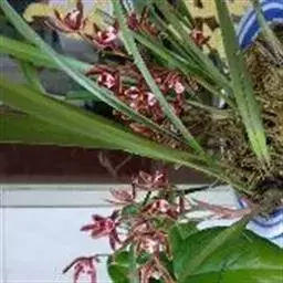 风兰 H.H.Hu):植株高8-10厘米。茎长1-4厘米,稍扁,被叶鞘所包。叶厚革质,狭长圆状镰刀形。…