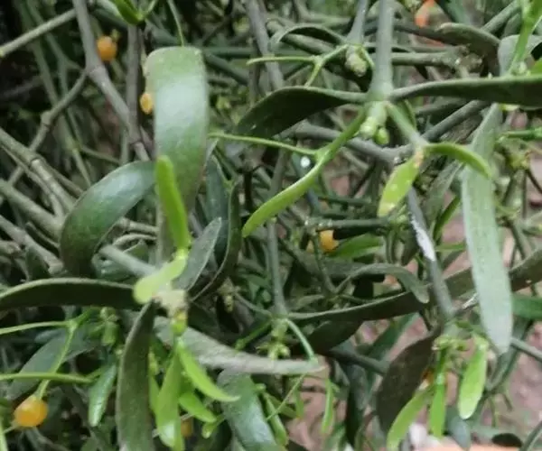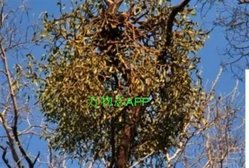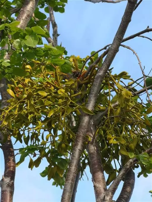 槲寄生,顾名思义,就是寄生在其他植物上的植物,可以从寄主植物上吸取水分和无机物,进行光合作用制造养分。它四季常青,开黄色花朵,入冬结出各色的浆果。据记载,寄生于榆树的槲寄生果实为橙红色,寄生于杨树和枫杨的果实呈淡黄色,寄生于梨树或山荆子的则呈红色或黄色。