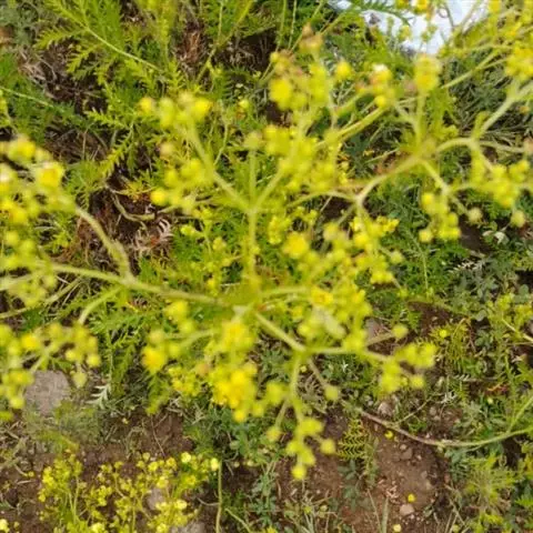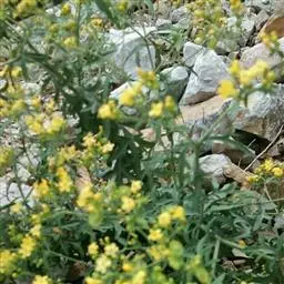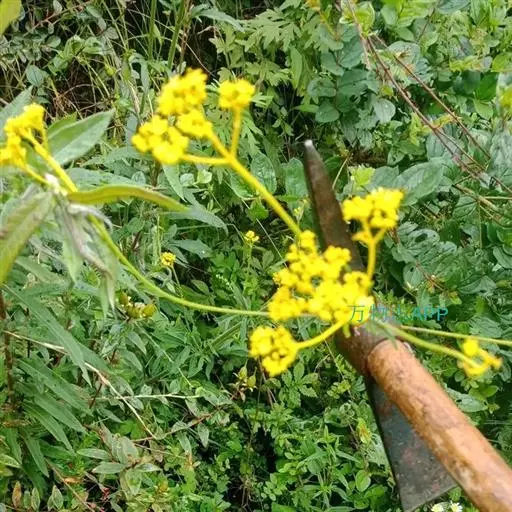 糙叶败酱( Patrinia rupestris Juss.subsp.scabra H.J.Wang),败酱科植物,多年生草本,茎丛生,茎上部多分枝,叶对生,裂片倒披针形、狭披针形或长圆形,聚伞花序顶生,呈伞房状排列,花小,黄色,花冠合瓣,果实翅状,卵形或近圆形,种子位于中央。