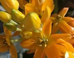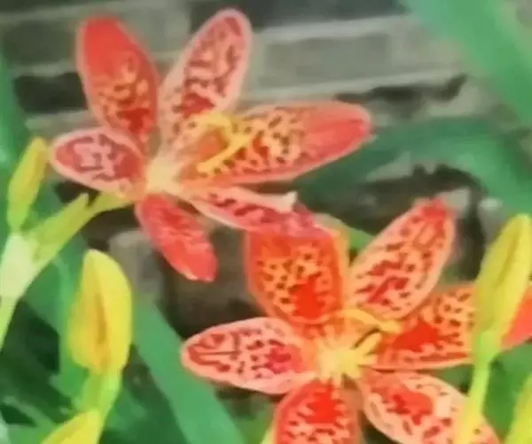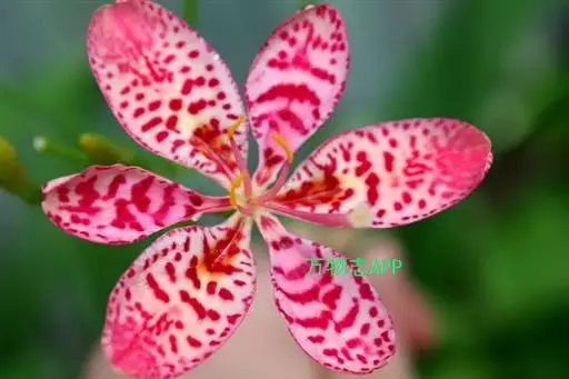 花序顶生,叉状分枝,每分枝的顶端聚生有数朵花;花梗细,长约1.5厘米;花梗及花序的分枝处均包有膜质的苞片,苞片披针形或卵圆形;花橙红色,散生紫褐色的斑点,直径4~5厘米;花被裂片6,2轮排列,外轮花被裂片倒卵形或长椭圆形,长约2.5厘米,宽约1厘米,顶端钝圆或微凹,基部楔形,内轮较外轮花被裂片略短而狭;雄蕊3,长1.8~2厘米,着生于外花被裂片的基部,花药条形,外向开裂,花丝近圆柱形,基部稍扁而宽;花柱上部稍扁,顶端3裂,裂片边缘略向外卷,有细而短的毛,子房下位,倒卵形,3室,中轴胎座,胚珠多数。
