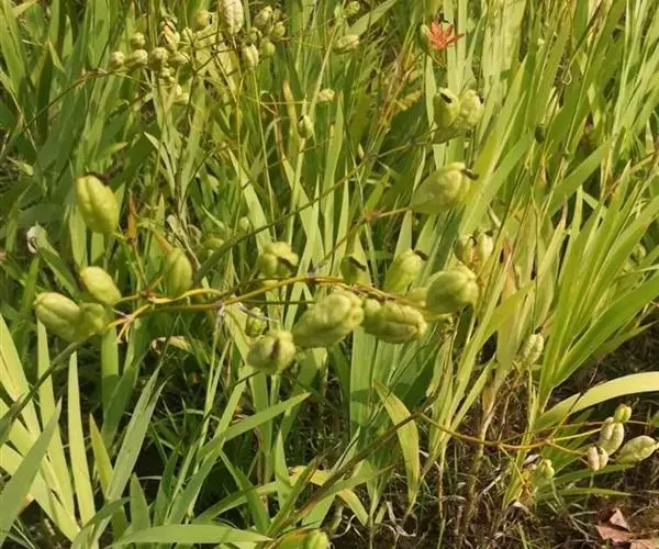 蒴果倒卵形或长椭圆形,黄绿色,长2.5~3厘米,直径1.5~2.5厘米,顶端无喙,常残存有凋萎的花被,成熟时室背开裂,果瓣外翻,中央有直立的果轴;种子圆球形,黑紫色,有光泽,直径约5毫米,着生在果轴上。花期6~8月,果期7~9月。 图版42: 1-5