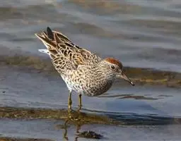 头顶暗褐色,头顶中央具乳黄色或淡黄白色中央冠纹和一条不甚显著的眉纹;上背栗色,羽缘皮黄色,翅上覆羽具白色条纹。背中部红褐色,具黑色横斑和淡色羽缘。下背、腰和尾上覆羽和背相似,但羽色较暗。头两侧淡白色,微具黑色斑点。颏、喉白色,胸棕黄色,两侧具少许暗褐色斑点;腹白色,两胁具黑色和栗色“V”形斑。肩、内侧翅覆羽和最内侧飞羽同背,但具宽的皮黄白色羽缘,外哃具黑色和棕色斑点。