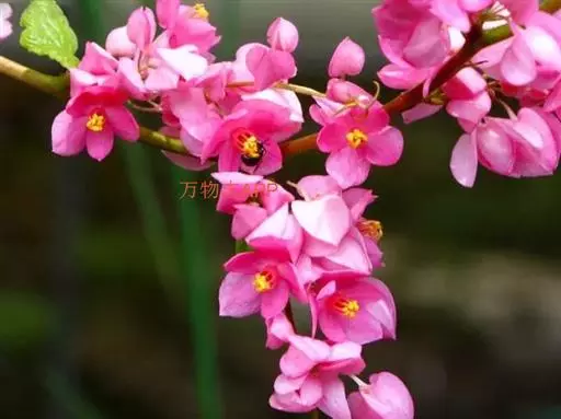 花序总状,顶生或腋生,花序轴顶部延伸变成卷须;花稀疏,淡红色或白色;花被片5,在果期稍增大,外轮3片比内轮2片大;雄蕊7-8;花柱3。瘦果卵状三角形,长约10毫米,平滑,包于宿存的花被内。