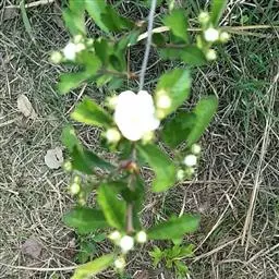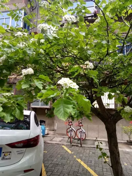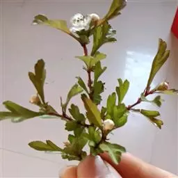 山里红 落叶乔木,植株生长茂盛。高达6米,树皮粗糙,暗灰色或灰褐色;刺长约1-2厘米,有时无刺;小枝圆柱形,当年生枝紫褐色,无毛或近于无毛,疏生皮孔,老枝灰褐色;冬芽三角卵形,先端圆钝,无毛,紫色。