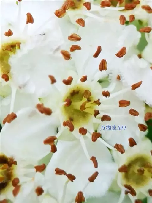 伞房花序具多花,直径4-6厘米,总花梗和花梗均被柔毛,花后脱落,减少,花梗长4-7毫米;苞片膜质,线状披针形,长约6-8毫米,先端渐尖,边缘具腺齿,早落;花直径约1.5厘米;萼筒钟状,长4-5毫米,外面密被灰白色柔毛;萼片三角卵形至披针形,先端渐尖,全缘,约与萼筒等长,内外两面均无毛,或在内面顶端有髯毛;花瓣倒卵形或近圆形,长7-8毫米,宽5-6毫米,白色;雄蕊20,短于花瓣,花药粉红色;花柱3-5,基部被柔毛,柱头头状。