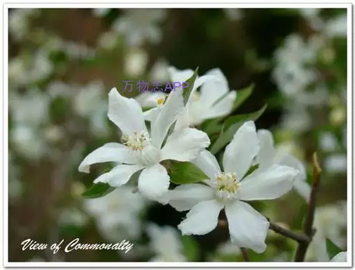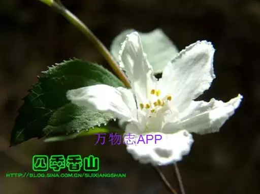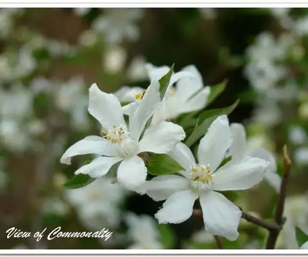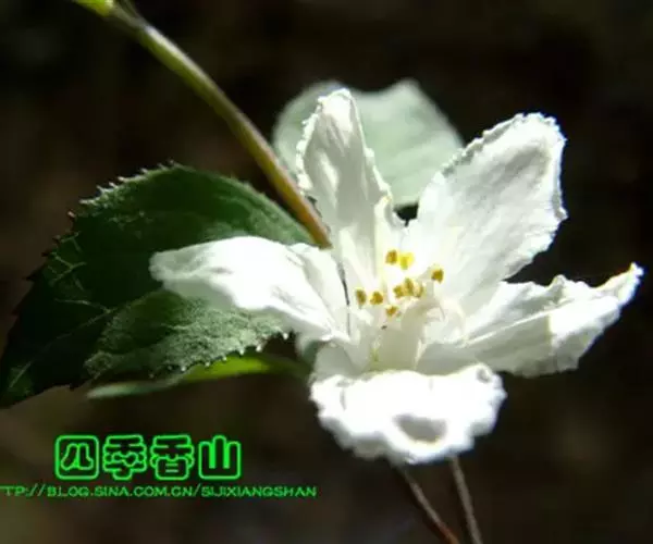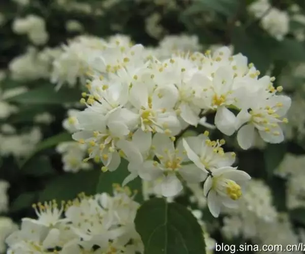 聚伞花序长和直径均1~3cm,具花(1~) 2~3朵;花蕾长圆形;花冠直径2~2.5cm;花梗长1~2mm,被星状毛;萼筒浅杯状,高约2.5mm,直径约4mm,密被灰黄色星状毛,有时具中央长辐线,裂片线状披针形,较萼筒长,宽1~1.5mm,被毛较稀疏;花瓣白色,长圆形或倒卵状长圆形,长约1.5cm,宽约7mm,先端圆形,中部以下收狭,外面被星状毛,花蕾时内向镊合状排列;外轮雄蕊长6~7mm,花丝先端2齿,齿平展或下弯成钩状,花药卵状长圆形,具短柄,内轮雄蕊较短,形状与外轮相同;花柱3(~4),约与外轮雄蕊等长。