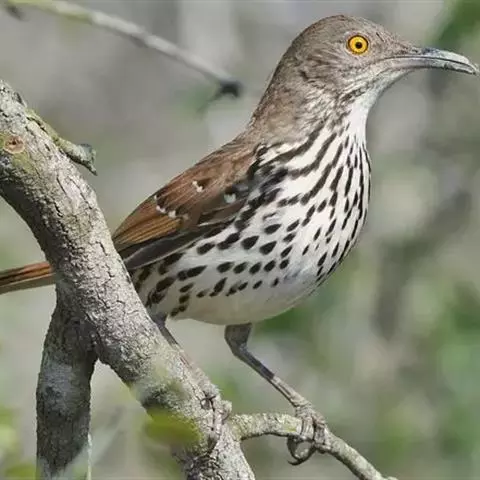 雌鸟上体橄榄色,额至后颈橄榄褐色,腰部较灰色。耳羽橄榄褐色具白色羽干纹,两翅和尾褐色,外翈羽缘灰棕色,飞羽内翈暗褐色。颏,喉灰白色微沾栗红色、缀有黑褐色斑点,两侧斑点连成一条线状,上胸灰色具黑褐色斑点,胸侧,两胁、腋羽和翼下覆羽橙栗色,胸和两胁杂有黑色斑点,有的两胁呈橄榄灰色,微沾橙栗色,腹中部和尾下覆羽白色。