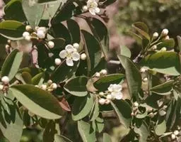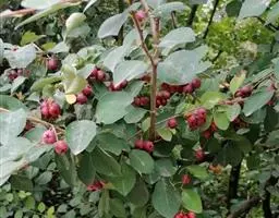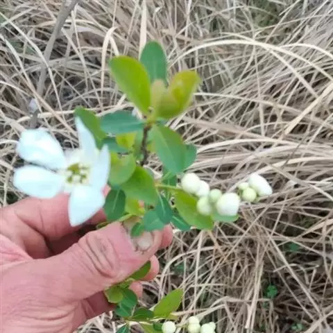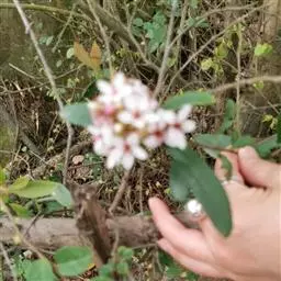 叶阔披针形,长约7厘米,宽约4厘米,先端锐尖,基部楔形,边缘有重锯齿,下部叶3浅裂,上部叶不分裂,上面深绿色,无毛或仅叶脉处有短柔毛,下面灰绿色,仅叶脉特别是主侧脉相交处,有黄色星状簇毛,叶柄长1-2厘米,微被短柔毛,托叶披针形,先端渐尖,边缘近全缘,长2-5毫米,有短柔毛或星状毛。伞房花序,直径2-4厘米,花梗长1-3厘米,总花梗和花梗密被星状毛,苞片披针形,无锯齿,有星状毛,花白色,花蕾稍粉红色,花径5-10毫米,萼筒杯状,萼片三角形,均密被星状绒毛,花瓣倒卵形,长4毫米,宽2毫米,雄蕊20-30,长于花瓣,花药紫色,子房2-3,外被密毛。蓇葖果无毛,幼果先端淡红色。花期7月,果熟期8月。