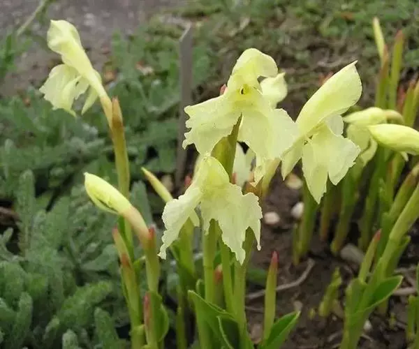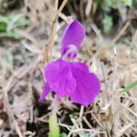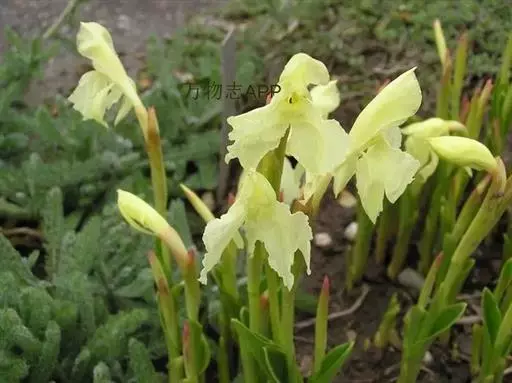 株高15- 30 (60) 厘米;根粗,棒状;茎基具2-3枚薄膜质的鞘。叶2-4片,披针形或线形,长5-15(40)厘米,宽1.5-3厘米,稍折叠,无柄;叶舌长仅1毫米。花后叶而出或与叶同出;穗状花序通常有花2-5 (8) 朵,基部包于卷成管状的苞片内,总花梗显著,长3-9厘米或更长,高举花序于叶丛之上,苞片长3.5-5厘米;花黄色或蓝紫色、深紫色、白色;花萼管长3-4厘米,一侧开裂至中部,顶端2裂;花冠管纤细,较萼管稍长,裂片披针形,长2.5-3厘米,后方的1枚兜状而具小尖头;侧生退化雄蕊近倒卵形,长1.5-2厘米;唇瓣倒卵形,长2.5-3厘米,2深裂几达基部,稍重叠,外缘皱波状;花药线形,连距长1-1.5厘米。蒴果长圆形,长达1.8厘米。花期:6-8月。